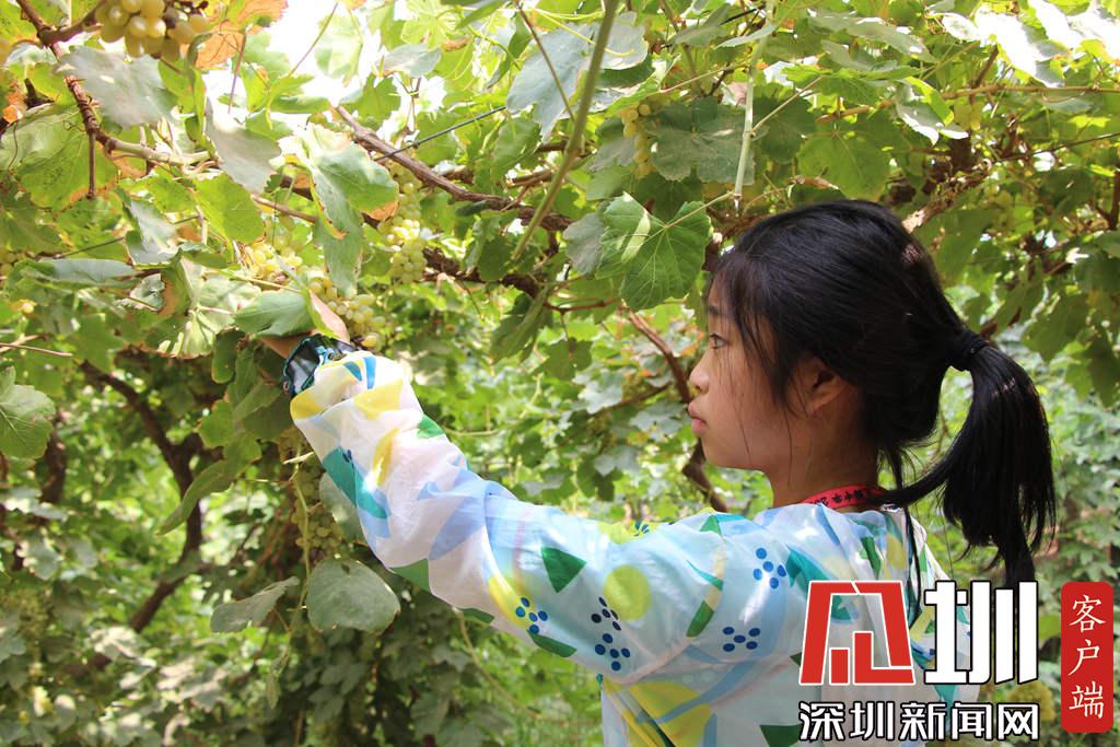 學生在葡萄溝景區(qū)里摘葡萄。(深圳新聞網(wǎng) 記者吳梓欣 攝)