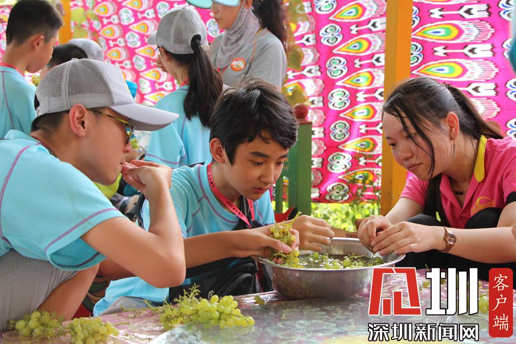學生們在葡萄溝景區(qū)里品嘗葡萄。(深圳新聞網(wǎng) 記者吳梓欣 攝)