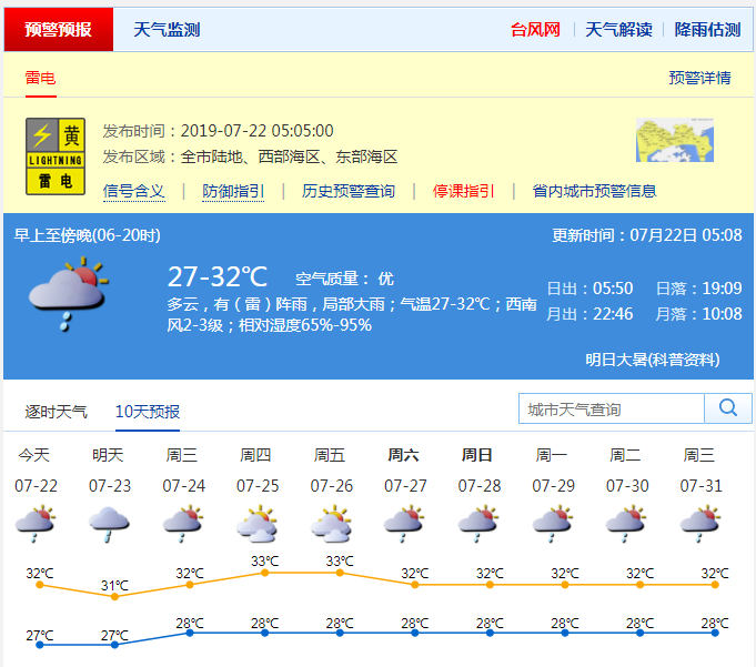 深圳新聞網(wǎng)2019年7月22日訊 炎熱與局地陣雨是近日深圳天氣的主題。據(jù)市氣象局預(yù)計(jì),未來兩天我市依然陽光陣雨相伴,部分時(shí)間雨勢(shì)較大。其中,22日多云,有(雷)陣雨,局部大雨;27-32℃;西南風(fēng)2-3級(jí);濕度65%-95%。預(yù)計(jì)23-24日有(雷)陣雨,局部大雨;25-26日天氣炎熱,有局地短時(shí)陣雨。