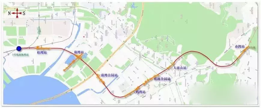 深圳地鐵5號線南延線(二期工程)北起于5號線前海灣站,經(jīng)前海、南山,終點(diǎn)與地鐵2號線赤灣站換乘。