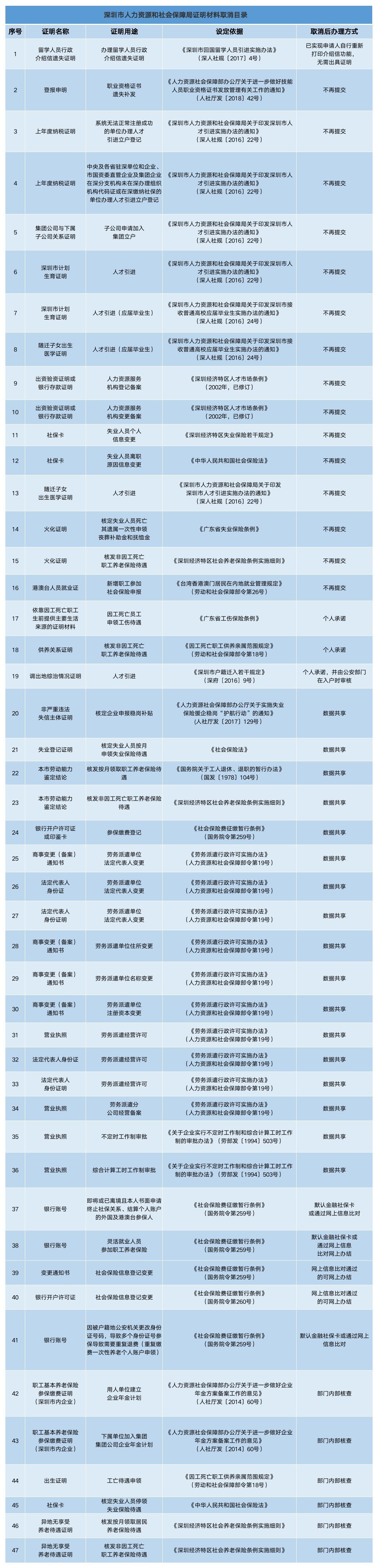 深圳新聞網(wǎng)2019年7月25日訊(見圳客戶端、深圳新聞網(wǎng)記者 施冰冰)據(jù)“深圳人社”微信公眾號(hào)消息,為了減證便民、優(yōu)化服務(wù),深圳市人力資源和社會(huì)保障局取消了47項(xiàng)證明材料。其中包括新增職工參加社會(huì)保險(xiǎn)申報(bào),港澳臺(tái)人員就業(yè)證不用再提交;人才引進(jìn)(應(yīng)屆畢業(yè)生),深圳市計(jì)劃生育證明、隨遷子女出生醫(yī)學(xué)證明無需再提交;勞務(wù)派遣單位法定代表人變更,法定代表人身份證、商事變更(備案)通知書等實(shí)現(xiàn)數(shù)據(jù)共享等等等等……