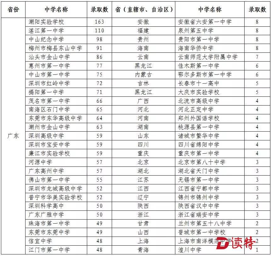 絕大部分考生來(lái)自全國(guó)知名重點(diǎn)中學(xué)。其中廣東的潮陽(yáng)實(shí)驗(yàn)學(xué)校錄取人數(shù)最多,達(dá)到163人;湛江第一中學(xué)錄取110人;中山紀(jì)念中學(xué)錄取98人。深圳錄取人數(shù)最多的是紅嶺中學(xué),錄取72人。