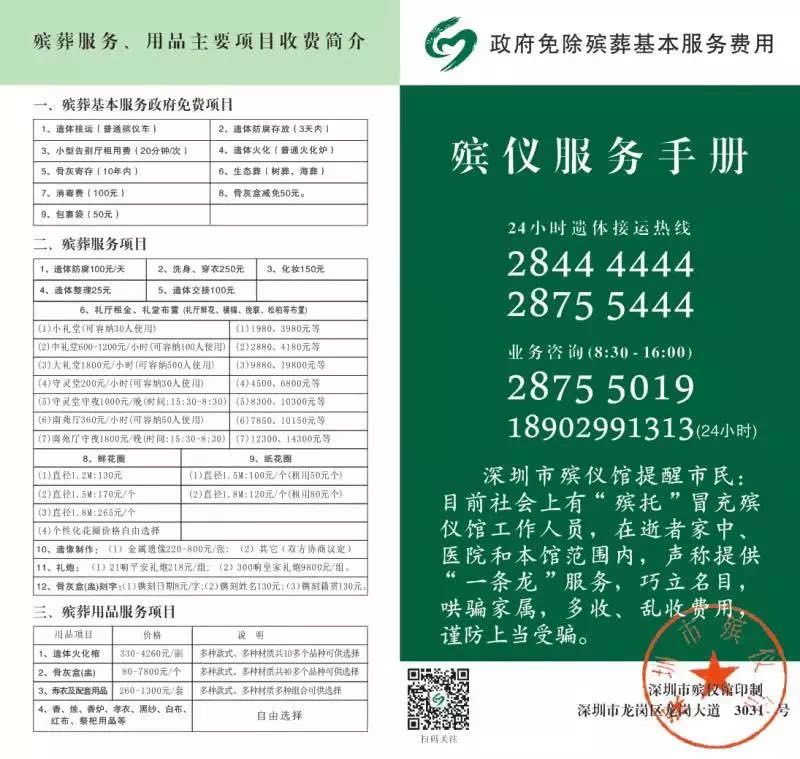 “深圳只有一家合法的殯儀館,就是深圳市殯儀館,其殯儀收費(fèi)標(biāo)準(zhǔn)可以通過(guò)‘深圳民政在線(xiàn)’的‘殯儀服務(wù)’查詢(xún)?!笔袣浌芩嚓P(guān)負(fù)責(zé)人表示,市民也可以關(guān)注“深圳市殯儀館”的微信公眾號(hào)查詢(xún)治喪流程、聯(lián)系電話(huà)和收費(fèi)標(biāo)準(zhǔn)。