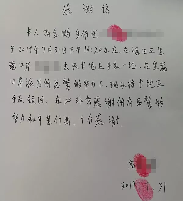 7月31日,皇崗口岸派出所接到事主高先生報(bào)警稱(chēng),其17時(shí)許在皇崗口岸某處遺失一塊手表(購(gòu)置價(jià)4萬(wàn)余元)。巡段民警周剛迅速出警,將事主帶回派出所詢(xún)問(wèn)情況,民警周元華通過(guò)大數(shù)據(jù)分析研判,發(fā)現(xiàn)遺失手表被一男子拾到,且該男子一直在原地等待失主并未離開(kāi)。隨后,周元華將男子帶回派出所歸還失物,高先生向拾金不昧的好心人表示感謝,并給民警們寫(xiě)下感謝信。