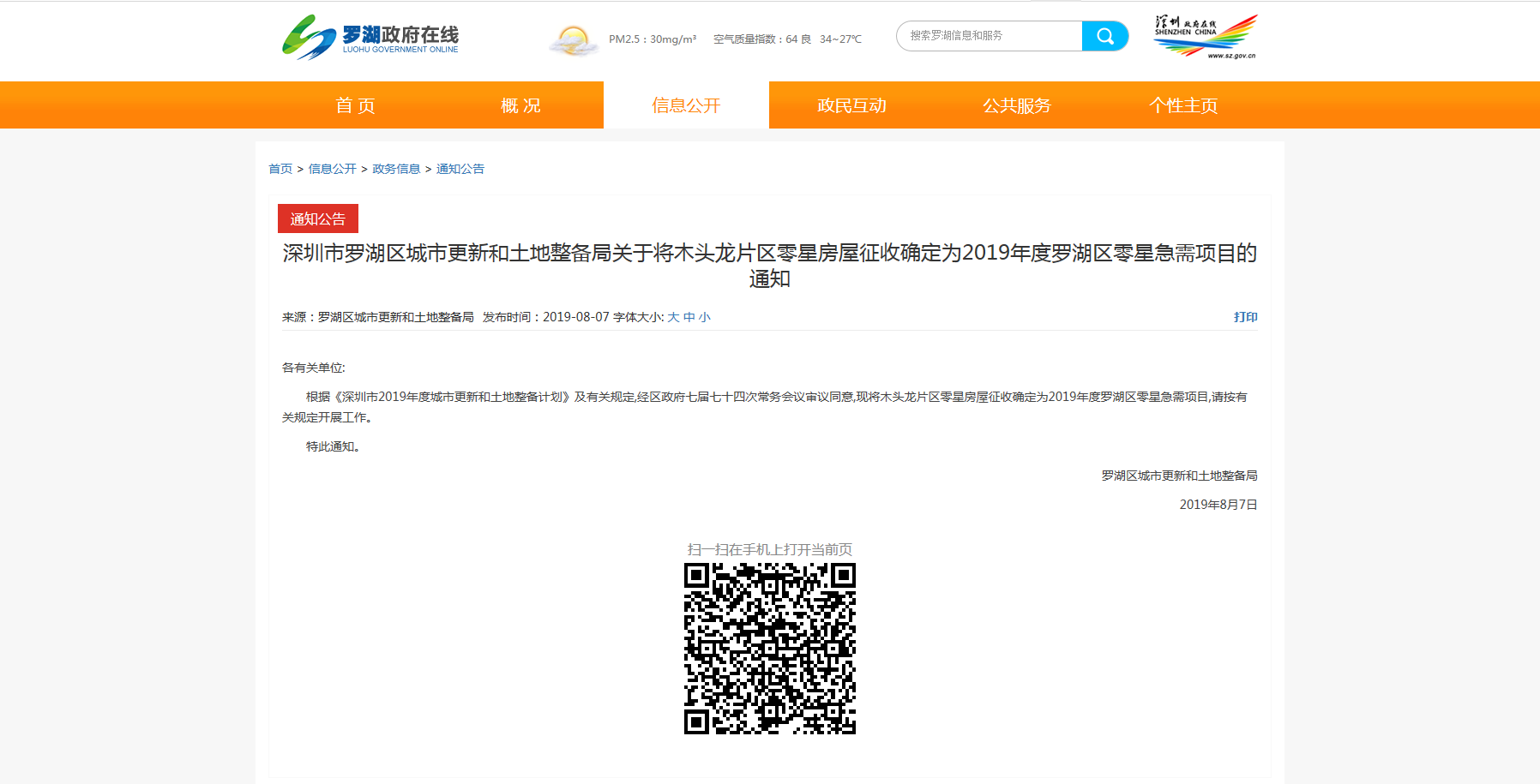 “經(jīng)過全面分析,木頭龍項目涉及眾多公共利益、現(xiàn)狀存在重大社會風(fēng)險的情況下,根據(jù)《深圳市2019年度城市更新和土地整備計劃》房屋征收專項計劃中明確的‘考慮到各區(qū)公共利益項目的急需,各區(qū)區(qū)級房屋征收計劃可安排零星急需項目1項’,羅湖區(qū)政府將木頭龍片區(qū)零星房屋征收確定為2019年度羅湖區(qū)零星急需項目,并啟動征收程序,盡快破解重大歷史遺留難題,防范和化解重大風(fēng)險,落實項目配套的交通設(shè)施、保障性住房等急需公共利益?!彼f,政府將依法依規(guī)實施房屋征收并進(jìn)行征收補(bǔ)償,保障被征收人的合法權(quán)益。