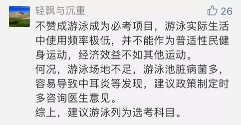 對于游泳納入中考體育必考選項(xiàng),家長們的看法不一。支持者認(rèn)為,“游泳本來就是一項(xiàng)求生技能,納入考試,孩子們都要學(xué)習(xí),除了鍛煉身體,還能減少意外的發(fā)生。”也有人認(rèn)為“很多學(xué)校都沒有開設(shè)游泳課,學(xué)習(xí)硬件設(shè)施跟不上也白搭?!狈磳φ邉t認(rèn)為,“游泳實(shí)際生活中使用頻率極低,并不能作為普適性健身運(yùn)動,納入選考更合適”“學(xué)校的硬件設(shè)施跟不上,課外游泳培訓(xùn)費(fèi)傷不起?!?/p>
