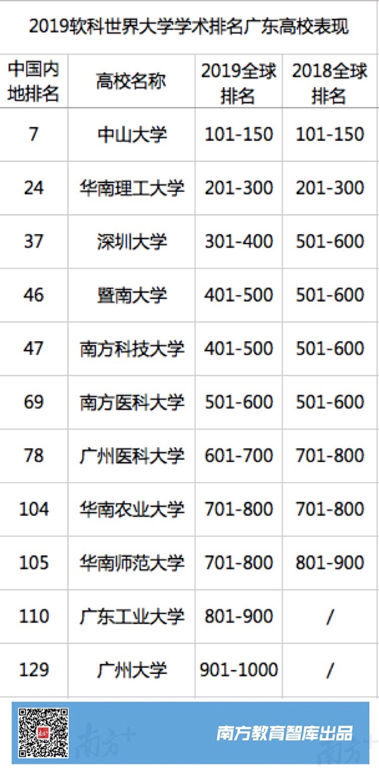 廣東高校共有11所上榜,上榜數(shù)量僅次于江蘇(20所)和北京(19所),排名第3。中山大學位居全球101-150位,中國內(nèi)地第7名;華南理工大學全球201-300位,位列中國內(nèi)地第24位。此次進步最大的是深圳大學,從去年全球501-600位飆升至301-400位,全國排名第37名。進步的還有暨南大學和南方科技大學,升至全球401-500位。