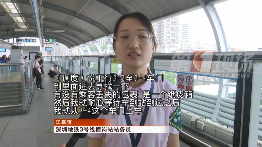 當時,一輛列車即將到達龍崗的橫崗站,站務員從3-4號門上車尋找。最終,站務員在列車座位下面找到了乘客遺失的紙箱,并通知乘客前往橫崗站。