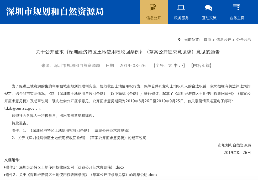 據(jù)了解,目前該《條例》(草案公開征求意見稿)正向社會(huì)公開征求意見,公開征求意見期限為2019年8月26日至2019年9月25日,有關(guān)意見請(qǐng)發(fā)送至電子郵箱:tdzb@pnr.sz.gov.cn。