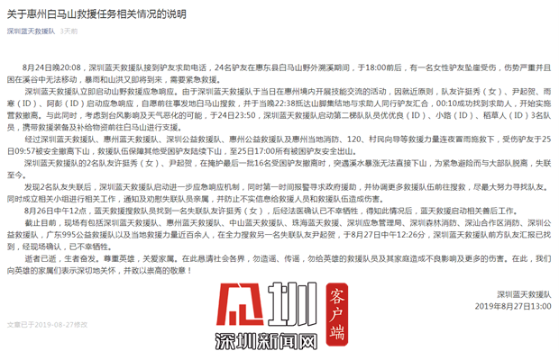 見(jiàn)圳客戶(hù)端?深圳新聞網(wǎng)2019年8月30日訊(見(jiàn)圳客戶(hù)端、深圳新聞網(wǎng)記者 張玲)8月27日下午,深圳藍(lán)天救援隊(duì)發(fā)布消息稱(chēng):8月25日,救援隊(duì)兩名隊(duì)友在掩護(hù)最后一批受困驢友撤離時(shí),突遇溪水暴漲無(wú)法直接下山,為緊急避險(xiǎn)而與大部隊(duì)脫離失聯(lián)。8月27日中午,最終將兩名隊(duì)友找回,經(jīng)確認(rèn),兩名隊(duì)員許挺秀(女)、尹起賀已不幸犧牲。