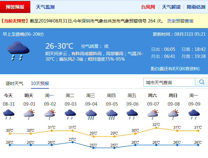 31日陰天間多云有陣雨或雷陣雨,局部暴雨;26-30℃;偏東風2-3級;濕度75%-95%。9月1-3日有陣雨或雷陣雨,2-3日沿海、高地和海區(qū)最大陣風7級左右;4-6日有一次暴雨降雨過程。