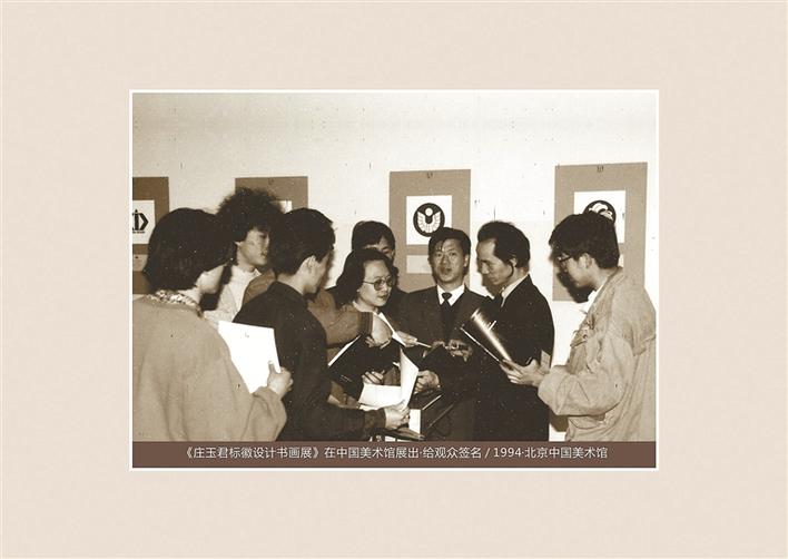 ▲1994年,《莊玉君標(biāo)徽設(shè)計書畫展》在中國美術(shù)館展出,莊玉君在現(xiàn)場給觀眾簽名。
