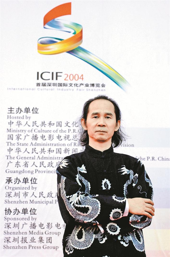 ▲2004年,莊玉君和他設(shè)計的文博會會徽“七彩文”。