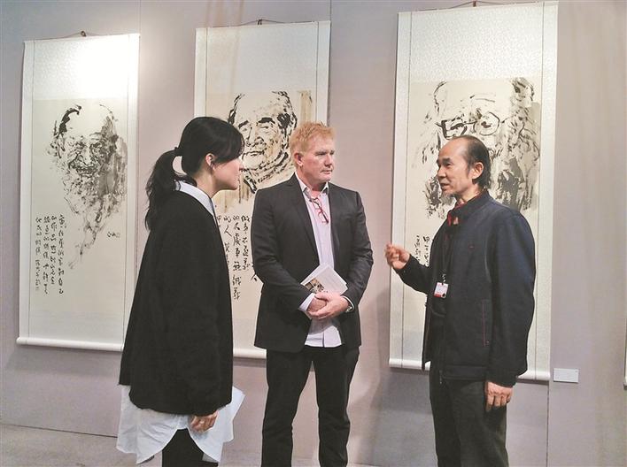 ▲2015,在“2015洛杉磯藝術(shù)博覽會”的中國國家展現(xiàn)場,莊玉君與觀展者交流。