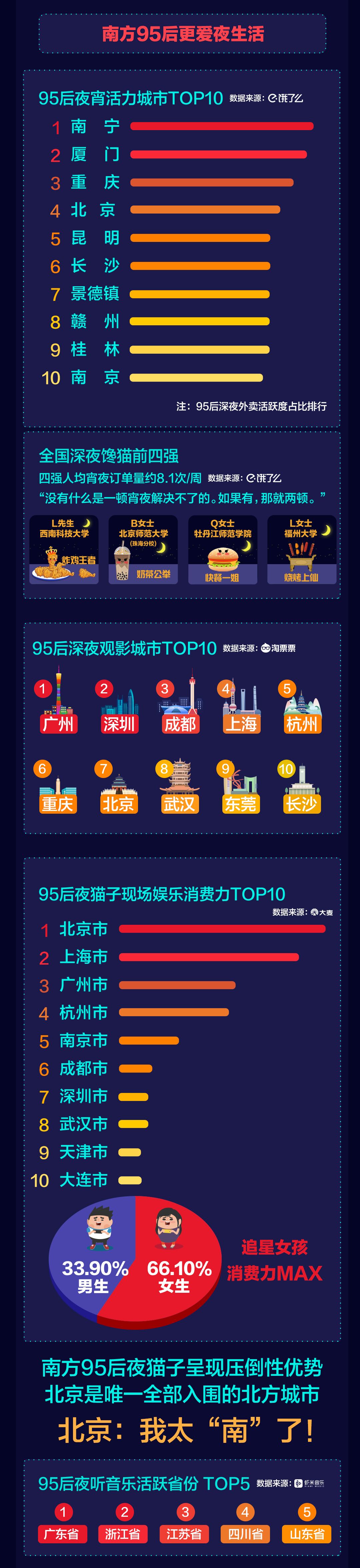 《95后夜貓子報告》顯示,95后年輕人在夜間觀影、追劇、看演出等文化消費領(lǐng)域表現(xiàn)十分活躍;南方城市的95后夜貓子在各項消費活動中表現(xiàn)尤其突出。