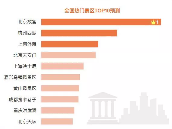 根據(jù)交通運輸部科學(xué)研究院報告顯示,國慶全國熱門景區(qū)TOP10北京故宮、杭州西湖、上海外灘位列前三位,另外還有北京天安門、上海迪士尼、嘉興烏鎮(zhèn)風(fēng)景區(qū)、黃山風(fēng)景區(qū)、成都寬窄巷子、重慶洪崖洞、北京天壇位列其中。