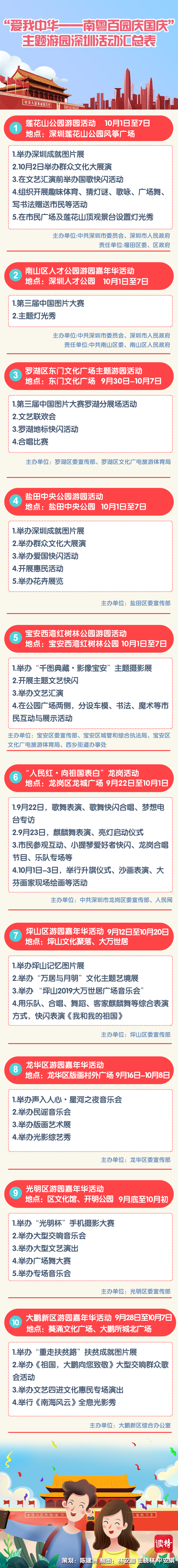 深圳特區(qū)報2019年9月26日訊 為熱烈慶祝中華人民共和國成立70周年,深圳市將舉辦規(guī)模盛大的全市性專場音樂會、群眾文藝晚會、焰火晚會等活動,同時將在各區(qū)舉辦80場“我和我的祖國”國慶群眾文藝嘉年華活動,并在全市各區(qū)舉行“愛我中華——南粵百園慶國慶”主題游園。各有關(guān)活動安排如下: