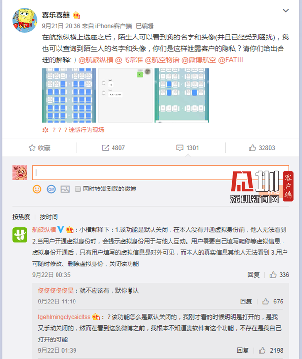 見圳客戶端.深圳新聞網(wǎng)2019年9月26日訊(見圳客戶端、深圳新聞網(wǎng)記者 張玲)“航旅縱橫”APP,最近因?yàn)橐粋€(gè)舉動(dòng)被用戶質(zhì)疑泄露個(gè)人隱私。9月21日,微博網(wǎng)友@喜樂(lè)喜囍發(fā)微博稱,這款A(yù)PP默認(rèn)開啟“允許他人與我進(jìn)行私聊”,在用戶選座后,陌生人可以查詢到自己的名字和頭像。該博主將陌生人騷擾的頁(yè)面截圖發(fā)上了微博,引發(fā)網(wǎng)友熱烈討論,在其個(gè)人話題下,有評(píng)論1301條,轉(zhuǎn)發(fā)4807次。