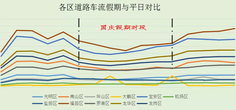 市內(nèi)交通除大鵬和鹽田區(qū)較平日有所上升外,其余各區(qū)均較平日車流減少30%左右。假日期間車流將集中在非上下班高峰的時(shí)間段。