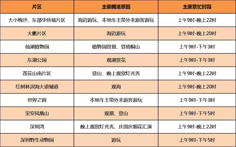 假日期間市內(nèi)交通每個(gè)時(shí)間段相對(duì)均衡,不會(huì)出現(xiàn)工作日的早晚高峰,車輛主要集中在市內(nèi)各景點(diǎn)和商圈周圍,預(yù)計(jì)東部景區(qū)將會(huì)迎來巨大壓力,尤其是大小梅沙、東部華僑城、鹽壩高速葵涌出口。