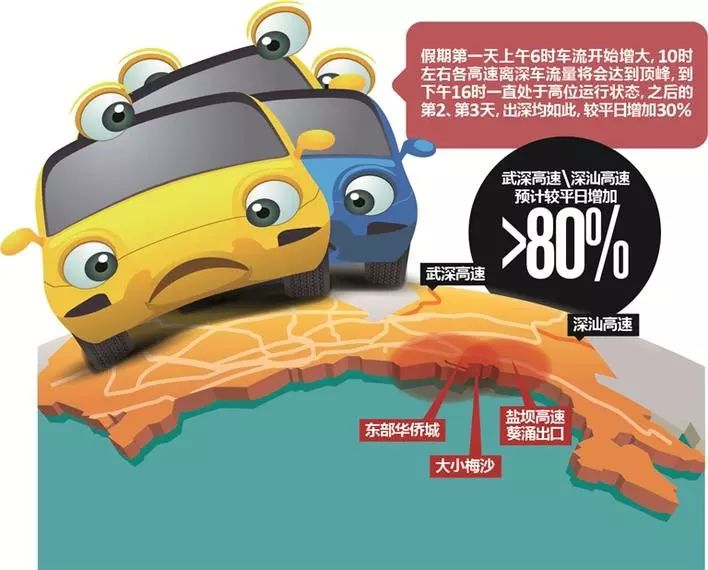 ⑩深圳交警預(yù)測(cè)全市從9月30日下午開(kāi)始交通流量加大,9月30日、10月1日出行量達(dá)到頂峰。各高速公路、市內(nèi)各景點(diǎn)、商圈、購(gòu)物點(diǎn)以及東部景區(qū)會(huì)出現(xiàn)不同程度的擁堵,全市各區(qū)羅湖區(qū)最為擁堵,其次是福田區(qū)、南山區(qū)。預(yù)計(jì)‘國(guó)慶’期間,全市出深和入深車輛總數(shù)均將超過(guò)170萬(wàn)輛。