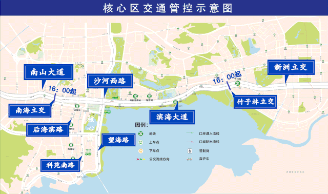 以深圳灣人才公園為中心,濱海大道(南海立交至竹子林立交段雙方向)、沙河西路(濱海大道至東濱立交雙方向)、望海路(東濱立交至中心段雙方向)、中心路(科苑南路至望海路雙方向)、科苑南路(東濱路至中心路段東側)、東濱路(后海濱路至科苑南路段,不含)、后海濱路(濱海大道至東濱路,不含)的合圍區(qū)域?qū)嵤┙煌ü苤?;以及濱海大道東往西方向(竹子林立交至南海立交),西往東方向(南海立交至竹子林立交)實施交通管制。