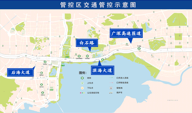以深圳灣人才公園為中心,濱海大道(南海立交至竹子林立交段雙方向)、沙河西路(濱海大道至東濱立交雙方向)、望海路(東濱立交至中心段雙方向)、中心路(科苑南路至望海路雙方向)、科苑南路(東濱路至中心路段東側)、東濱路(后海濱路至科苑南路段,不含)、后海濱路(濱海大道至東濱路,不含)的合圍區(qū)域實施交通管制;以及濱海大道東往西方向(竹子林立交至南海立交),西往東方向(南海立交至竹子林立交)實施交通管制。