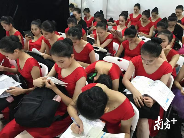 在晚會(huì)的另一個(gè)彩排候場(chǎng)點(diǎn),36名來(lái)自深圳高級(jí)中學(xué)舞蹈團(tuán)的參演學(xué)生在彩排和演出間隙仍然抓緊學(xué)習(xí)。深圳高級(jí)中學(xué)舞蹈團(tuán)老師高潔說(shuō),這是舞團(tuán)候場(chǎng)的常態(tài),“為了不耽誤學(xué)習(xí),經(jīng)常得抓緊間隙進(jìn)行學(xué)習(xí)。”