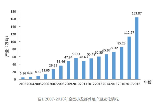 隨著生活水平的提高,人們對“食”提出了更高要求,色香味俱全的美食往往也更讓人難以抗拒。火鍋燒烤小龍蝦作為當代青年人的“最愛”,已獨得恩寵許多年,尤其是小龍蝦。每年夏季,是吃小龍蝦的旺季。據(jù)部分媒體不完全統(tǒng)計,光南京一個城市每年的龍蝦消費量都超萬噸,而北上廣深蓉5個城市,小龍蝦門店數(shù)均超3000家。此外,據(jù)2019年中國小龍蝦產(chǎn)業(yè)發(fā)展報告顯示,小龍蝦產(chǎn)業(yè)總產(chǎn)值達3690億元,占據(jù)了第三產(chǎn)業(yè)產(chǎn)值的主導(dǎo)地位。這種巨大的消費力帶動了小龍蝦養(yǎng)殖業(yè)的發(fā)展,到2018年,全國小龍蝦養(yǎng)殖產(chǎn)量已超163萬噸。