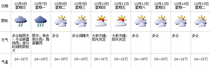 今明兩日有中到大雨,局部暴雨,降雨集中在6日午后至7日上午,部分時(shí)間伴有雷暴,沿海和高地陣風(fēng)6-8級(jí),6日氣溫24-31℃;8-11日多云到晴天;12日有小雨。假期返程高峰期有明顯降雨和大風(fēng),請(qǐng)加強(qiáng)海上活動(dòng)和道路交通安全的管理。