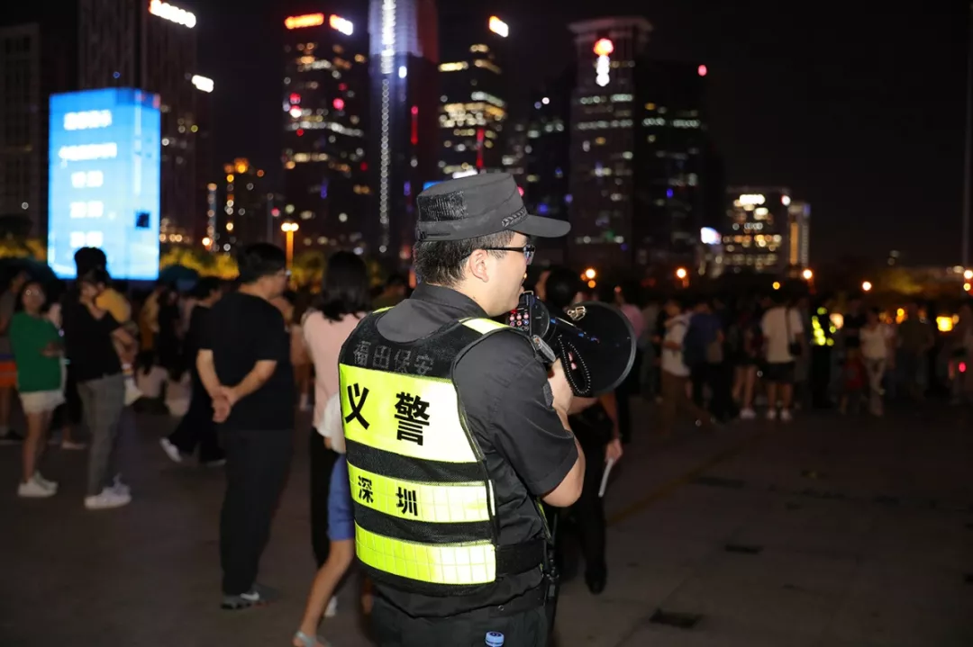 此外,福田公安分局根據(jù)市民中心和蓮花山頂廣場的每日人流負荷情況實時調(diào)整,及時協(xié)調(diào)城管調(diào)控燈光秀播出時間并加演,避免人流停滯,緩解疏導壓力。值得一提的是,為了方便市民夜間行走,觀賞區(qū)特地“開辟”了幾條新的應急道路,并在所有“黑暗死角”都加裝了應急燈。福田公安分局指揮處處長張保軍表示:“在安保警力多次實地巡查后,及時發(fā)現(xiàn)問題并整改、疏通光線不足及堵塞人群的道路,使市民們在觀看完燈光秀后能夠更加安全、快捷地離開?!背艘酝猓谌肆髅芗臒艄庑悻F(xiàn)場,孩童走失、物品遺失的情況也有發(fā)生,安保人員不斷地通過廣播尋人、尋物,進行實名登記,盡心盡力地為市民、游客解決切身難題。