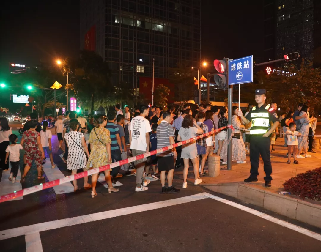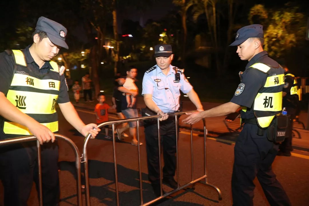 “同一個時間、同一個地點,如何保證十幾萬人看完燈光秀,安全、有序、祥和地離開,這不是一個簡單的安保工作,是一個系統(tǒng)工程?!备L飬^(qū)副區(qū)長、公安分局局長江峰表示。本次燈光秀疏導工作在國慶節(jié)前已做了預案,警力每天下午五點半就全部上崗,保證所有的閘口人員就位,封控福中三路和深南大道輔道,利用隔離帶當鐵馬,人流北進南出?!拔覀兺ㄟ^在廣場各出入口及周邊路段,加裝地鐵、公交指示牌,全程指引疏導人群走向。對市民中心地鐵站六個出入口進行單循環(huán)規(guī)劃,所有觀眾進場都是單行線,這樣人群不會形成對沖,保證疏導有序進行。”福田公安分局副局長譚慶彬介紹道。