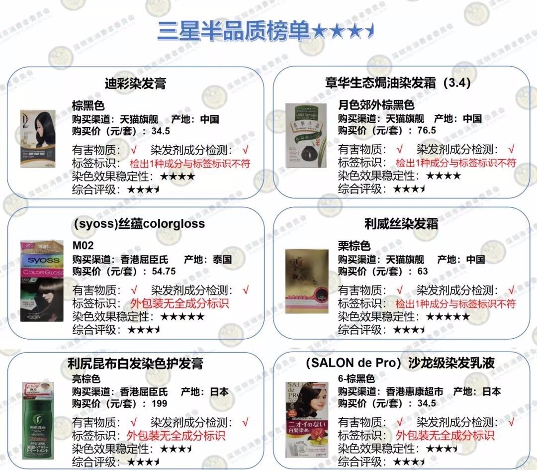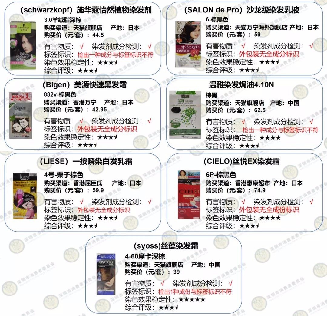 2款染發(fā)產品染發(fā)劑成分檢出量不符合本次比較試驗標準要求。此外,多款產品被檢測出個別成為與標簽標識不符問題。
