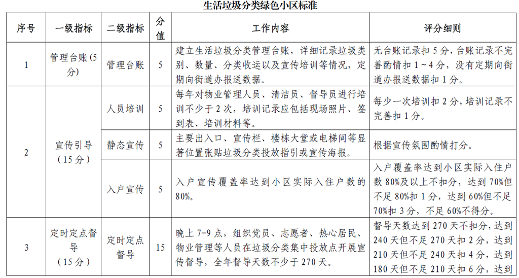 分類成效顯著的住宅區(qū),可認(rèn)定為“生活垃圾分類綠色小區(qū)”。獲獎(jiǎng)小區(qū)將通報(bào)表?yè)P(yáng)并按照10萬(wàn)元/1000戶的標(biāo)準(zhǔn)補(bǔ)助,不足1000戶的,每減少100戶,補(bǔ)助資金減少5%,超過(guò)1000戶的,每增加100戶,補(bǔ)助資金增加5%,最高補(bǔ)助不超過(guò)30萬(wàn)元,補(bǔ)助資金僅用于生活垃圾分類相關(guān)的設(shè)施采購(gòu)、宣傳培訓(xùn)以及勞務(wù)補(bǔ)貼等方面;生活垃圾分類綠色小區(qū)的物業(yè)服務(wù)企業(yè)可優(yōu)先申報(bào)深圳市級(jí)綠色物業(yè)管理評(píng)價(jià)標(biāo)識(shí),通過(guò)市住房建設(shè)部門審核后獲得綠色物業(yè)管理評(píng)價(jià)補(bǔ)助資金。