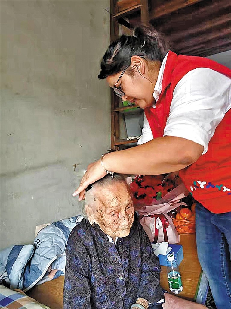 采訪當(dāng)天,老人看到來了這么多人,以為又是政府工作人員來慰問她了,好奇地問外孫女:“今天是過節(jié)嗎?”原來,逢年過節(jié)陳汝金都會(huì)收到慰問和祝福,社區(qū)工作人員和社康醫(yī)生也會(huì)經(jīng)常上門和她聊聊家常,了解老人家的身體狀況,因此老人對(duì)黨和政府送慰問送祝福一點(diǎn)都不陌生。去年,陳汝金老人剛滿百歲,鳳凰社區(qū)黨委還專門組織大家來到老人家中,為老人慶祝百歲生日,并送來大家的祝福和問候。