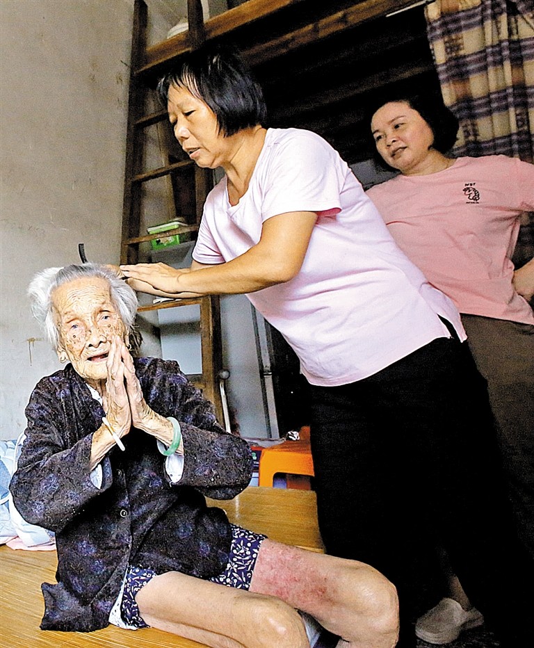 陳汝金老人喜歡打本地花牌,打到了99歲,后來腰部退化,不能久坐,她才沒有再打花牌。吃飯方面,陳汝金也有自己的主張,不求好不求貴,簡(jiǎn)簡(jiǎn)單單活到老,“外婆以前是生產(chǎn)隊(duì)的炊事員,直到去年她還能自己做飯呢?!痹谖男〗憧磥?,如此長壽的外婆也沒有特別的養(yǎng)生之道,“保持好心態(tài),順其自然就是最長壽的秘方?!?/p>