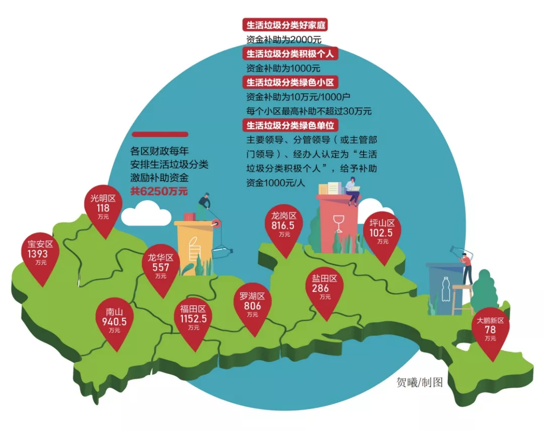 《辦法》明確規(guī)定,各區(qū)財政每年按以下額度安排生活垃圾分類激勵補(bǔ)助資金: