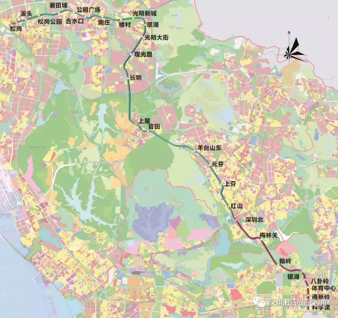 站點:科學(xué)館、通新嶺、體育中心、八卦嶺、銀湖、翰嶺、梅林關(guān)、深圳北、紅山、上芬、元芬、羊臺山東、官田、上屋、長圳、觀光路、光明大街、翠湖、光明新城、樓村、南莊、公明廣場、合水口、薯田埔、松崗公園、溪頭、松崗