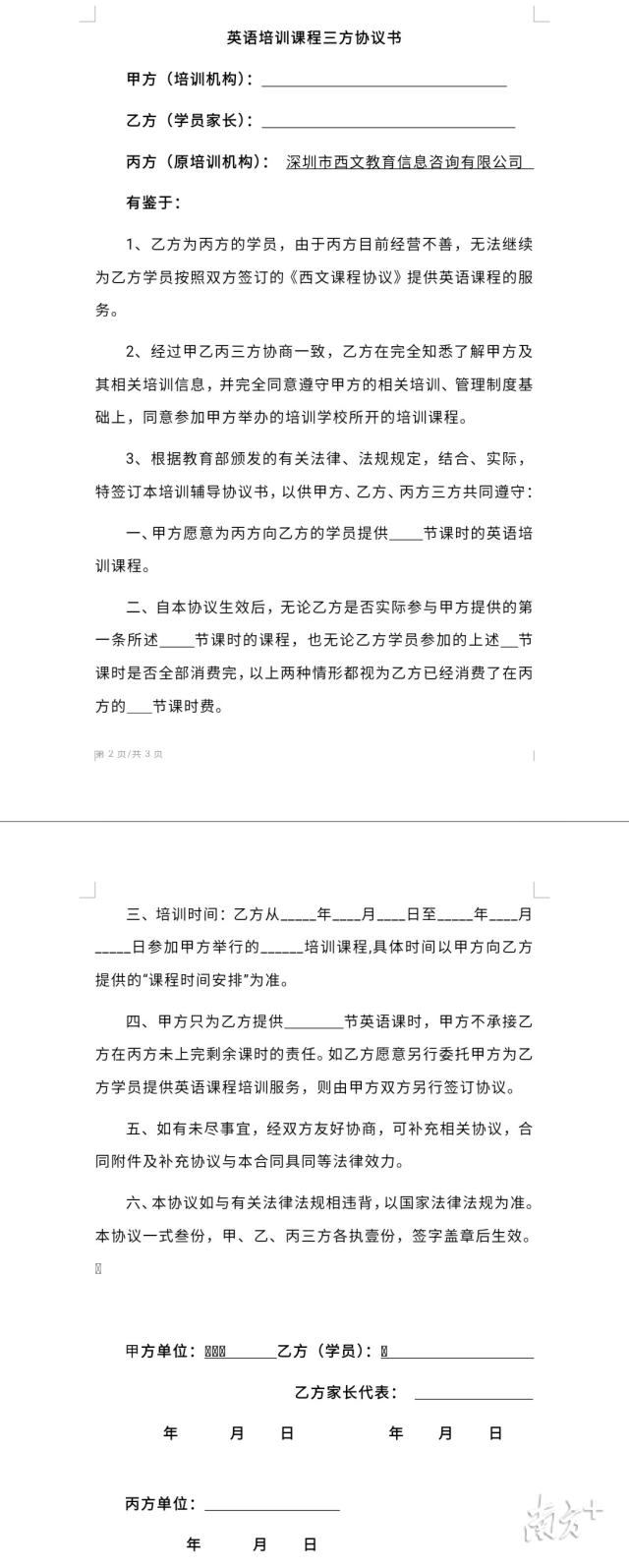 退費群里的周女士介紹,10月20日,西文英語提供了一份“英語培訓課程三方協(xié)議書”,但上面很多條款都沒有寫清楚。西文英語委托的律師稱,山姆大叔少兒英語愿意給西文英語的學員免費提供30節(jié)課程,但學員在西文英語其他剩余課時的解決方案,需自行和山姆大叔協(xié)商。