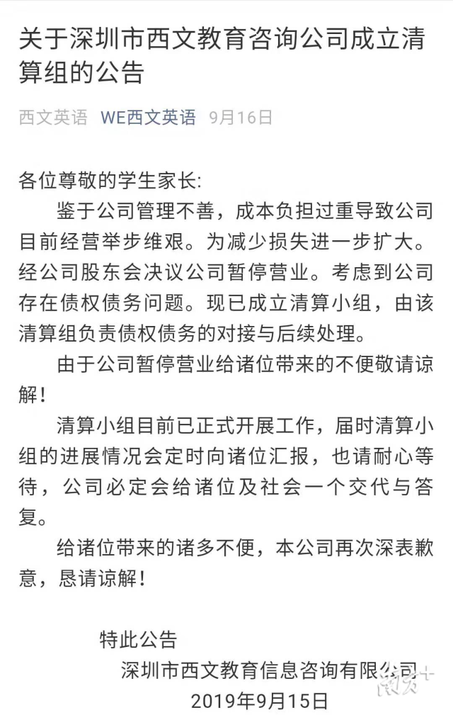 “9月9日時,西文英語還在正常營業(yè),當天還收了幾十個學員的學費。但第二天就關門了,貼著告示說暫停營業(yè),毫無預兆。”陳先生說。