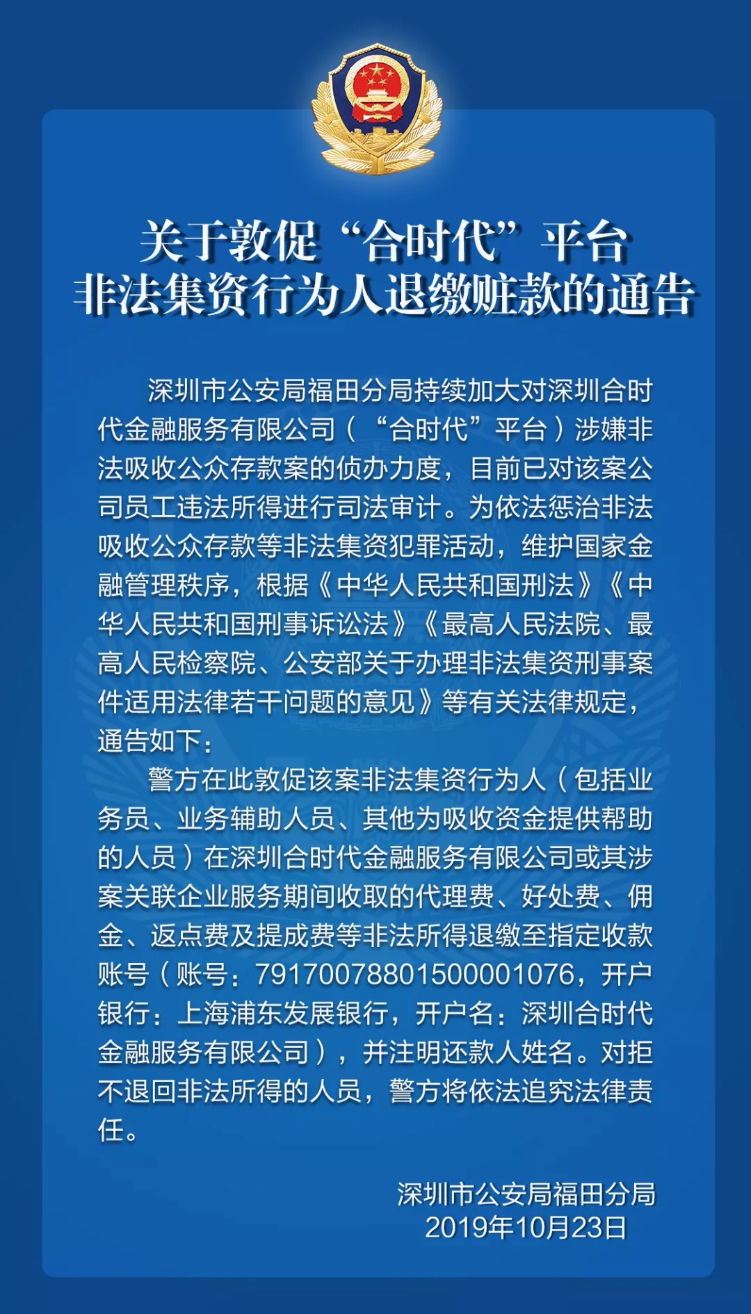 關(guān)于敦促“合時(shí)代”平臺(tái)非法集資行為人退繳贓款的通告