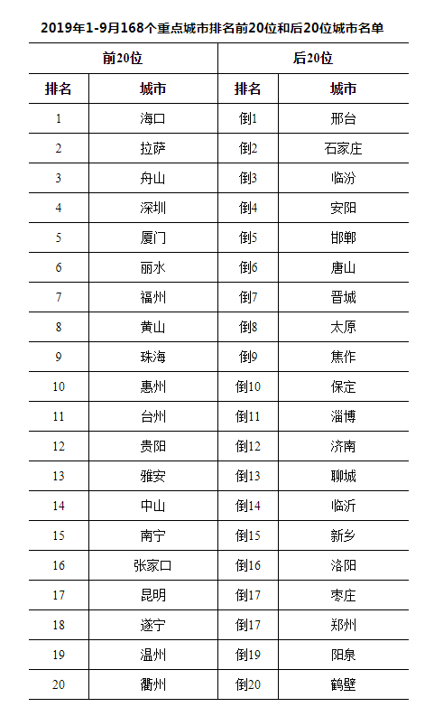 晶報(bào)2019年10月24日訊 10月23日,生態(tài)環(huán)境部發(fā)布2019年1—9月全國(guó)空氣質(zhì)量狀況。數(shù)據(jù)顯示,168個(gè)重點(diǎn)城市空氣質(zhì)量排名中,深圳位于???、拉薩、舟山之后,排名全國(guó)第四。