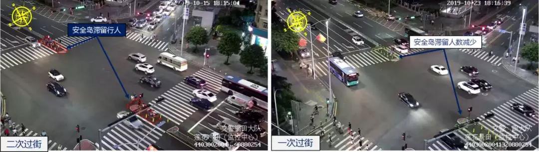 針對現(xiàn)狀問題,深圳交警采用單周雙次的信控策略,小批量、多頻次地放行嘉賓路方向車輛,緩解因公交車隊列化導(dǎo)致路口交通鎖死的問題;同時,采用行人專用相位集中放行行人,保障行人過街安全。路口優(yōu)化后,路口“回堵”現(xiàn)象顯著減少,行人過街安全性提高,路口高峰小時通過量從2130pcu/h增至2285pcu/h,上升7.28%。
