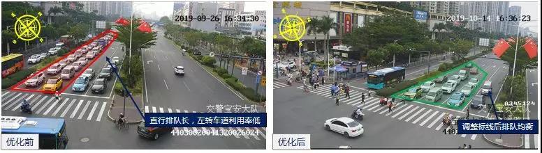針對這一問題,深圳交警根據(jù)路口各時段、各方向的通勤需求,調(diào)整優(yōu)化了路口紅綠燈配時方案,適當(dāng)增加了擁堵方向時間。優(yōu)化后,路口晚高峰西往東方向車輛排隊由300多米降至60米左右,下降80%,車輛基本實現(xiàn)1次通行。