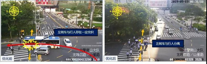 對此,深圳交警于9月11日對該路口進(jìn)行再優(yōu)化,調(diào)整東西向機動車放行方案,分離北面行人與西面左轉(zhuǎn)車,從而保障北面行人過街安全。優(yōu)化后,該路口東西行行人與同向左轉(zhuǎn)車分離,行人過街安全更有保障。