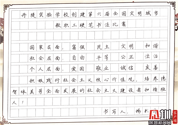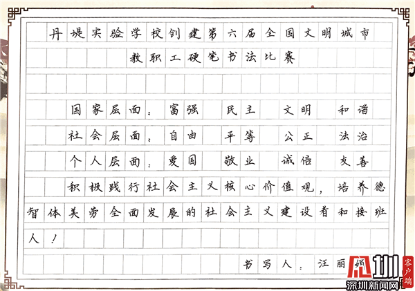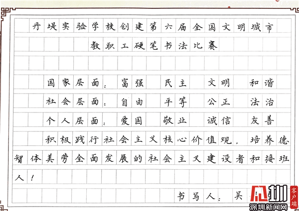見圳客戶端·深圳新聞網(wǎng)10月29日訊(見圳客戶端、深圳新聞網(wǎng)記者 潘寶儀 通訊員 袁小俊 圖/朱雅琪 ) 為落實立德樹人總目標、培育和踐行社會主義核心價值觀,創(chuàng)建文明城市,積極倡導(dǎo)全校教職工勤練教學(xué)基本功,提高教師綜合素養(yǎng),豐富課余生活,展示丹堤實驗學(xué)校教職工風(fēng)采,學(xué)校于10月25日舉行了“創(chuàng)建第六屆全國文明城市教職工硬筆書法比賽”。