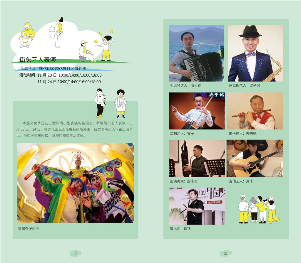引人關(guān)注的是,本屆公園文化季首次引進(jìn)街頭藝人表演,11月23日、24日,在蓮花山公園花展現(xiàn)場,吉他、薩克斯、笛子、笙、揚(yáng)琴、中阮、二胡、雜技、魔術(shù)等各類表演藝人輪番上演節(jié)目,為市民帶來輕松、浪漫的都市生活體驗(yàn)。