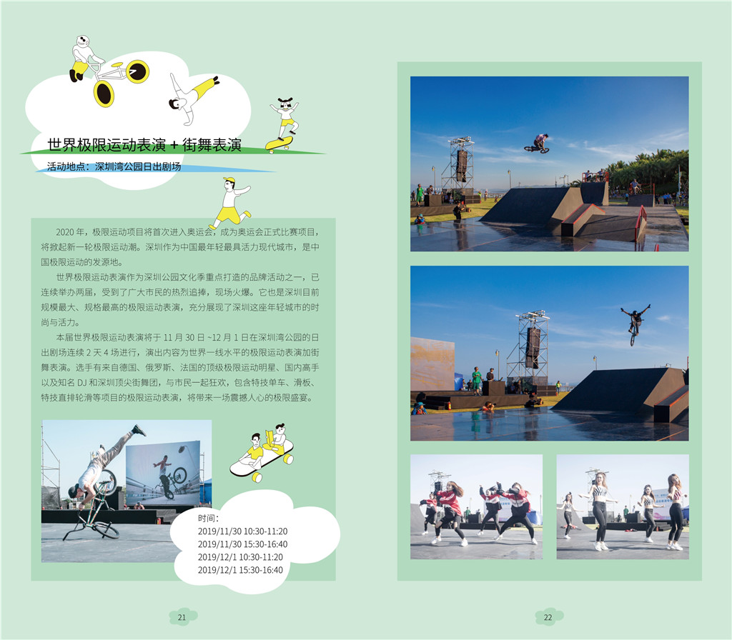 相比往年,今年既有年輕人熱衷的草地音樂會(huì)、街舞表演,針對(duì)青少年的網(wǎng)球、足球公開賽,又有兒童愛看的童話音樂劇,還有老年人喜愛的戲曲專場等等,活動(dòng)節(jié)目覆蓋各個(gè)年齡段。例如,今年的深圳灣草地音樂會(huì)由中央民族樂團(tuán)、廣州交響樂團(tuán)、深圳交響樂團(tuán)坐鎮(zhèn)表演,既突出民族特色,又有粵港澳和國際元素;世界極限運(yùn)動(dòng)由來自多國的頂級(jí)運(yùn)動(dòng)明星帶來表演。此外,還有多項(xiàng)首次開展的活動(dòng),例如,首屆自然教育嘉年華、新增街頭藝人表演等,契合深圳創(chuàng)意之都的特點(diǎn),彰顯深圳的包容與多元。