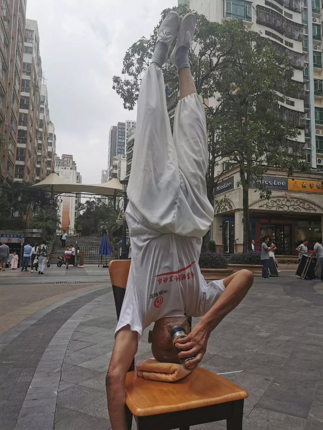 采訪當日,記者正在調試相機的時候,忽聞掌聲四起,原來魏宗信又在廣場上秀出拿手絕活“倒立”:
