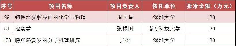 深圳大學(xué)2個,分別是:韌性水凝膠界面的化學(xué)與物理(項目負責人:周學(xué)昌);膀胱癌復(fù)發(fā)的分子機理研究(項目負責人:吳松);